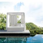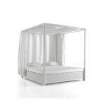 BALICAMA con estructura de aluminio blanco de 50×50 y 1,5 mm de espesor y ratán sintético blanco trenzado. Respaldos ajustables de 5 posiciones. Colchón de 10 cm de grosor y 25 Kg de densidad quick dry foam, desenfundable y tapizado, al igual que el techo y las cortinas, en tela Sunproof cartenza 164 gris, con tratamiento de protección para rayos UV y repelente al agua. Incluye dos cuadrantes en Wifera 211 turquesa.