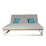 CHILLOUT Cama con estructura de aluminio blanco de 50×50 y 1,5 mm de espesor. Respaldos ajustables de 5 posiciones. Colchón de 10 cm de grosor y 25 Kg de densidad quick dry foam, desenfundable y tapizado, al igual que el techo y las cortinas, en tela Sunproof cartenza 164 gris, con tratamiento de protección para rayos UV y repelente al agua. Incluye dos cuadrantes en Wifera 211 turquesa.