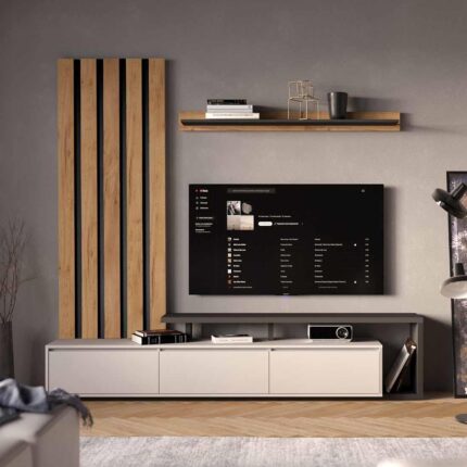 Con un diseño moderno y estilizado, la composición de salón Kler incluye un distintivo panel de lamas junto con un