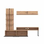Composición de salón modelo Évora que incluye: mueble tv, mueble alto con estantes y un estante superior que complementa la composición. Disponible en acabado artisan/carbón.