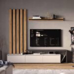 Con un diseño moderno y estilizado, la composición de salón Kler incluye un distintivo panel de lamas junto con un mueble bajo tv y un estante para complementar el conjunto.