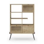 Librería 3 puertas modelo EVAN, fabricada en melamina y patas de metal. Disponible en color roble.